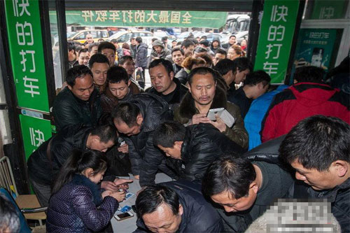 2014年2月19日,杭州“快的打车”服务点,出租车司机们排队安装软件。图片来源:CFP视觉中国2014年2月19日,杭州,随着“嘀嘀”、“快的”……