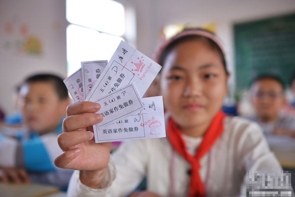 2013年10月16日,江苏镇江新区实验小学五年级(4)班的唐玥在展示她获得的五张“作业免做券”。封疆江 摄 图片来源:东方IC 版权作品 请勿转载10月16日,江苏镇……