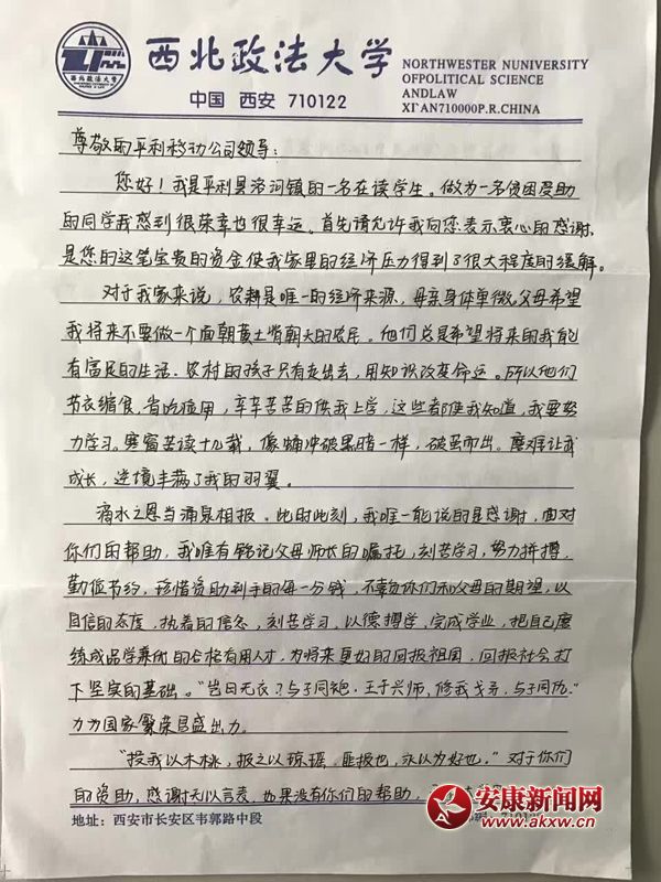 2016年11月24日一个平凡的日子里,一封从西北政法大学经济学院寄来的感谢信,“面对你们的帮助,我唯有铭记父母师长的嘱托,刻苦学习,努力拼搏,勤俭节约,珍惜资助到手的每一分钱,不辜负你们和父母的期望,以自信的态度,执着的信念,刻苦学习,以德博学,完成学业,把自己磨练成品学兼优的合格有用人才,为将来更好的回报祖国,回报社会打下坚实的基础。”她叫王梅,出生于一个贫困家庭的大学生,家住陕西省平利县洛河镇线河村一组,父亲身患残疾,母亲体弱多病,家庭生活仅靠父母务农、打短工维系,家庭月收入不足千元,尚有患精神病的外婆需要赡养。