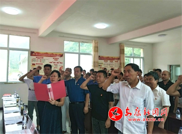 “我志愿加入中国共产党,拥护党的纲领,遵守党的章程……”7月17日,在老庄沟村二楼会议室里,来自市中心血站的20多名党员干部与老庄沟村全体党员统一佩戴党徽,整齐列队,举起右手,在党旗下庄严宣誓,重温入党誓词。