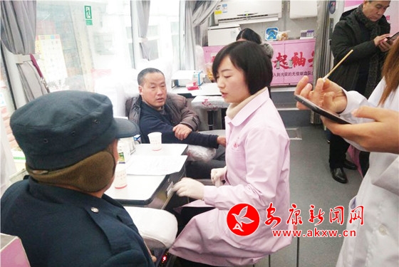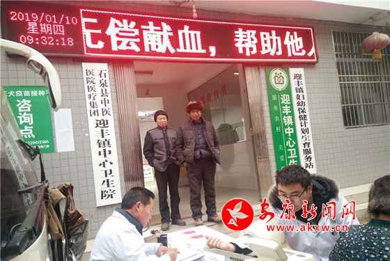 1月10日,天空飘着雪花,活动现场的献血车前,迎丰镇中心卫生院党员职工干部和排队献血的群众有序进入献血车,涓滴血液被抽取出来,汇集在一起。大多数献血者是初次献血,他们却一点儿也不紧张、不恐惧。纷纷表示献血是光荣的行动,愿意为需要的人做一些贡献。