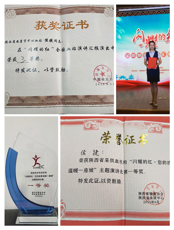我站血源管理科侯捷同志,根据自己血站岗位工作成长经历,结合血源一线招募典型事例,充分展示安康无偿献血招募宣传模式,以“成长在生命年轮中的信仰”为题,代表安康市中心血站参加陕西省“闪耀的红--您的故事温暖一座城”血站系统演讲比赛,以独特的视角和演讲效果夺得冠军,并选派于9月21日代表陕西省采供血行业参加“闪耀的红”全国血站演讲比赛荣获三等奖,是我站首次在全省、全国演讲比赛中取得的最佳成绩,为我站在全国范围内赢得了荣誉,为安康、陕西血站行业系统争了光,在全国血液行业内展示了我站职工昂扬向上的精神风貌。