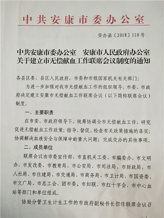 2、安康市率先在全省建立首个无偿献血联系会议制度 安康无偿献血联席会议制度是在安康市委、市政府领导下,由市委宣传部等21个市级部门和单位组成,协助分管卫生计生工作的市政府副秘书长担任联席会议召集人。联席会议每年召开一次全体会议,主要职责为统筹协调全市无偿献血工作,研究促进无偿献血工作相关政策,指导、督促、检查有关政策措施的执行落实,协调解决血液安全与保障中的重大问题。联系会议制度的建立,标志着我市无偿献血宣传招募模式“政府主导、部门协作、社会参与、城乡联动”的发展格局和长效机制得到进一步巩固和提升。