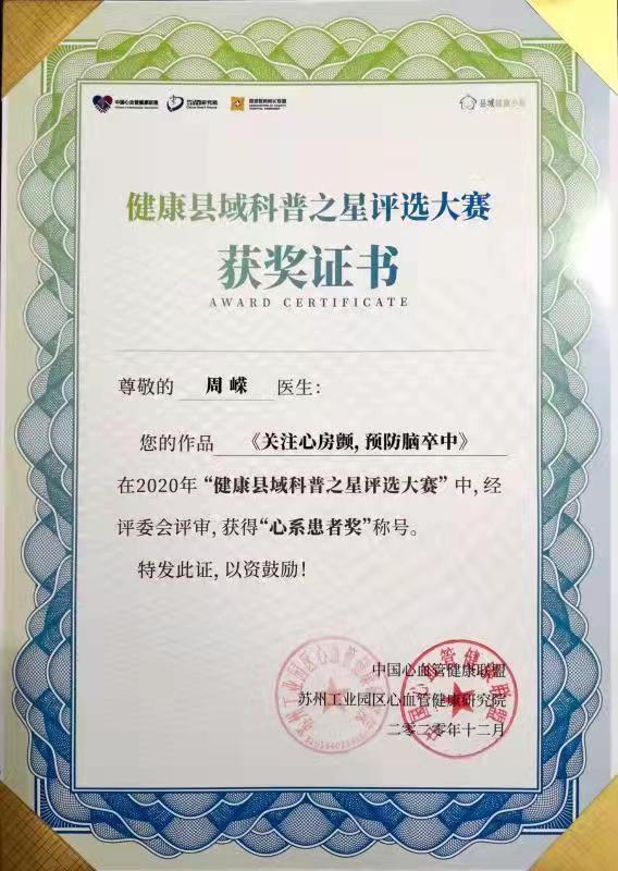 2020年 获第二届“互联网+健康中国”科普大赛“科普达人奖”
