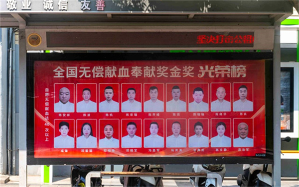 在第22个世界献血者日到来之际,安康市中心血站精心策划,自6月中旬起,在位于市政务大厅、市中心医院、市中心医院北院区门前的三处公交候车亭,以及中心城区两处LED大屏上,全天循环展播着安康市荣获“全国无偿献血奉献奖”终身荣誉奖、金奖、银奖、铜奖的获奖者代表风采照片。