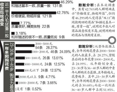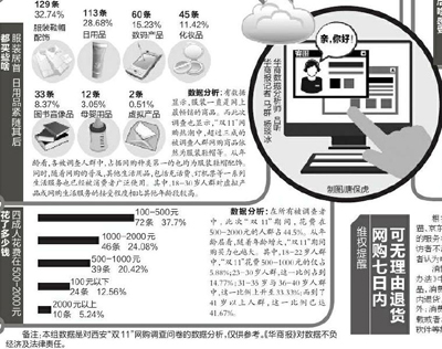 媒体对这些调查数据逐一分析。结果显示,“双11”期间,西安网购人群最爱买衣服,花费在500-2000元的人占44.5%。