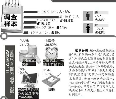 与此同时,在明确表示不参与“双11”抢购的人群中,33.33%的人担心商品质量,22.22%的人表示“不想凑热闹。”
