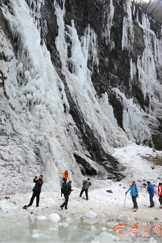 昨日下午2时,游客在户县涝峪黑山瀑布前合影留念。不时有冰块从瀑布上方掉落,着实让人捏了一把汗 记者 赵彬 摄