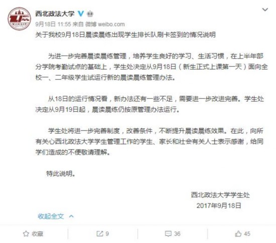 学生处将进一步完善制度,改善条件,不断提升晨读晨练效果。在此,向所有关心西北政法大学学生管理工作的学生、家长和社会有关人士表示感谢,给同学们造成的不便敬请理解。