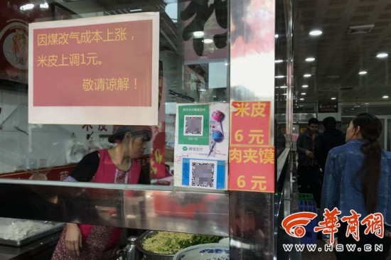 10月24日,有网友在华商论坛发帖:“秦镇米皮、肉夹馍借煤改气又涨成了六块钱。”网友称,“很久没有去吃秦渡镇的大米面皮了,近期路过桥西,寻了一家吃饭,吃一碗带一碗夹了一个馍共计18元!问馍多少钱,凉皮多少钱?掌柜的说,肉夹馍、凉皮涨价了,凉皮六块钱一碗,肉夹馍也涨价成了六块!”网友称,自己询问时得知“因为煤改气”,在“国庆期间开始涨价”。