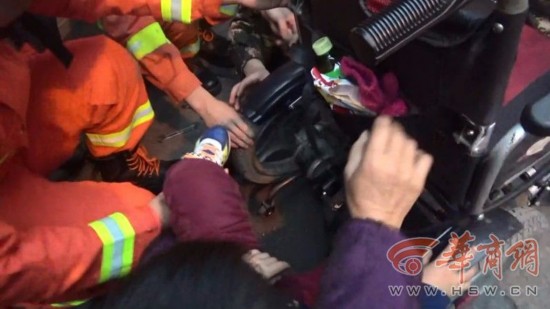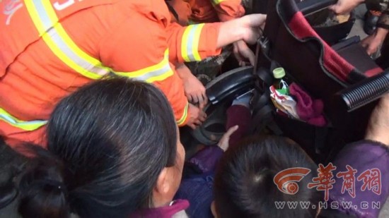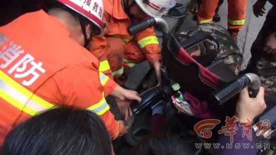 由于这辆轮椅是电动轮椅,小孩的脚就夹在轮椅的挡泥板和轮胎中间,要把小孩的脚取出来就得启动电源,这样更容易给小孩造成更大的伤害,消防人员只能一边安抚小孩的情绪,一边想办法利用工具拆卸电动轮椅,将挡泥板和轮子分离开来。