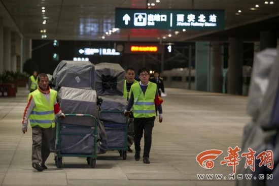 11月11日11时18分,80件累计1000公斤印有“中铁快运”字样的包裹箱“坐”上了G1294次高铁列车,从西安北一路疾驰向大连北驶去。这是今年“双11”电商黄金周期间西安铁路局新增大连方向的首趟高铁快运列车。yrw安康新闻网