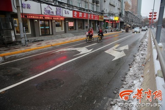 1月7日,在西安市咸宁路上,在宝马车打滑的路段上,早上下雪后,下午已经看不到积雪。 华商记者 邓小卫 摄影报道