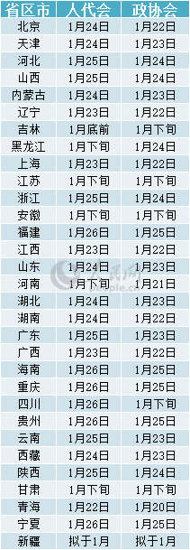 | 注:资料来源于各省日报,人大、政协网站或当地宣传部门,内容截至1月5日,实际时间以当地会议召开时间为准。 |