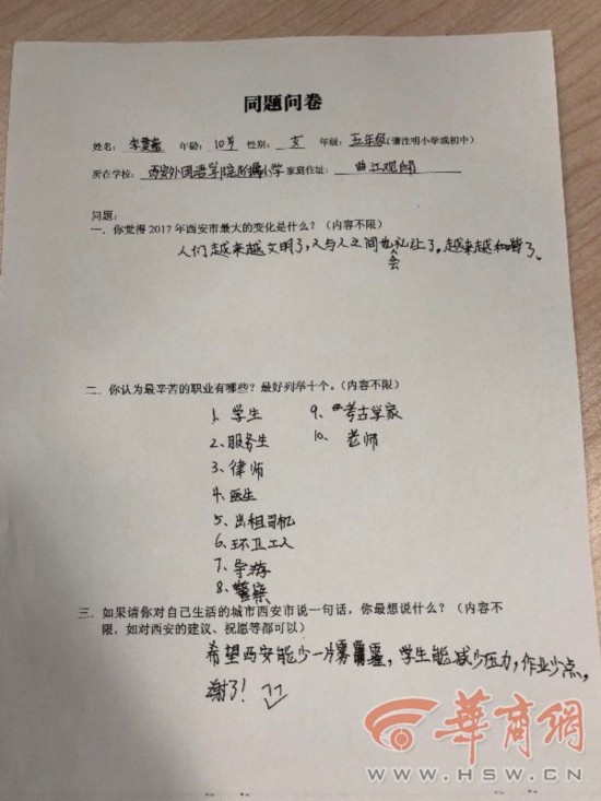 11岁的王慧倩在碑林区建国路小学上学,她写下环卫工人、医生,为啥呢?“环卫工人每天起得很早,回得很晚,地上有垃圾他们就得收拾。”她说,医生每天都要给病人看病,“很晚的时候,大家都睡觉了,要去找医生,医生不睡觉要给病人治病。”