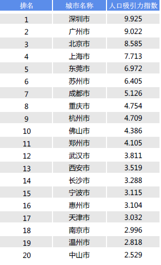 值得注意的是,西安在去年四季度主要城市的人口吸引力排名中,排名上升1位,排到了第12位,人口吸引力指数为4.201。去年四季度,全国主要城市人口吸引力前11位的城市分别是:广州、北京、深圳、上海、苏州、东莞、成都、郑州、重庆、杭州和武汉。