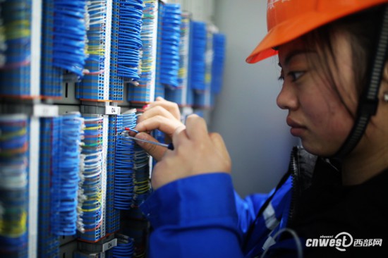十多平米的设备房内一片繁忙景象,四排信号机柜整齐排列,机柜里、地面上散落着很多线缆,每排柜子间都有一两个忙碌的女工,她们神情专注,各色的线缆在手上飞舞。