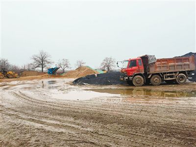 随后,记者来到国际港务区秦汉大道与西韩路十字西南,市铁腕治霾办3月12日曾检查过西韩路西侧的二灰石及沙石料场,当时场内存在大面积沙石、二灰石料、白灰未按要求覆盖,场内车行道路浮土较厚,冲洗设备不能正常使用,导致车辆带土上路长距离污染西韩路。市铁腕治霾办向国际港务区管委会下发了督办单,要求5个工作日内整改。3月20日是下发督办单后的第6个工作日,记者对该料场进行了回访,发现场内因为前几天下雨,泥泞不堪,不难看出,晴天时存在较厚浮土。同时,场内依旧有大量渣土未覆盖完善。
