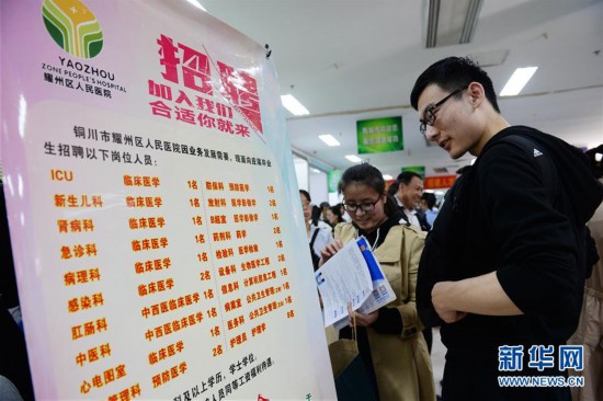 4月1日,学生在招聘会上了解铜川市耀州区人民医院招聘情况。当日,陕西省2018年县及县以下医疗卫生机构定向招聘医学类本科毕业生专场招聘会在陕西省人才交流服务中心举行,现场提供岗位2415个,涉及临床医学、预防医学、口腔医学、医学影像等专业。新华社记者李一博摄xuS安康新闻网