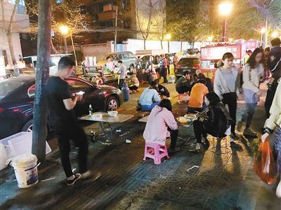 4月1日晚8时许,记者来到交大街,兰蒂斯城小区门前热闹不已。麻辣烫、砂锅、炒面、饺子、馄饨、米线、臭豆腐……各种小吃应有尽有,近20个小摊贩把小区门前的人行道包围得水泄不通。每个小吃摊都有不少食客,生意红火的同时,地面上却是一片狼藉。