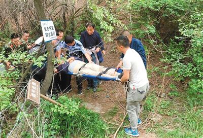 民警和众人用担架抬着杨某下山 通讯员 马秀珍 摄