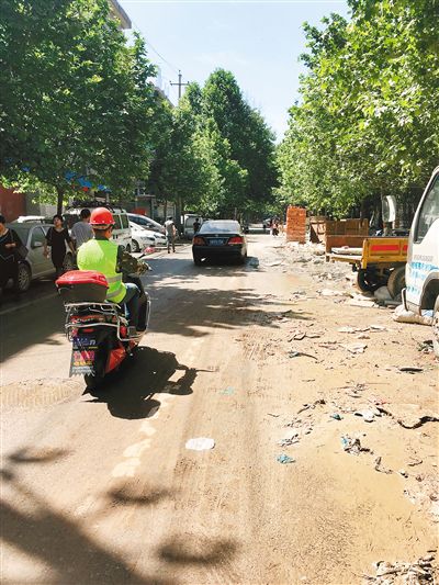 除了拥堵外,脏乱问题更是让大家烦心。记者看到,在体育馆东路北段的西侧,建筑垃圾、砖块堆、塑料袋和废弃材料等随处可见、任意堆积,人行道已不复存在。一工地内渣土与水混合在一起,使这条路泥泞不堪,空气中也弥漫着呛人的尘土味道,有的居民出行戴了口罩。“这个工地在这里一个多月了,垃圾、泥土、扬尘到处都是,洒过水后路上又变得泥泞,统共一百来米的路,大路走不成,人行道被霸占。”家住碑林区工商局家属楼的魏师傅推着婴儿车,正在小心翼翼地边走边看,以躲避过往车辆。