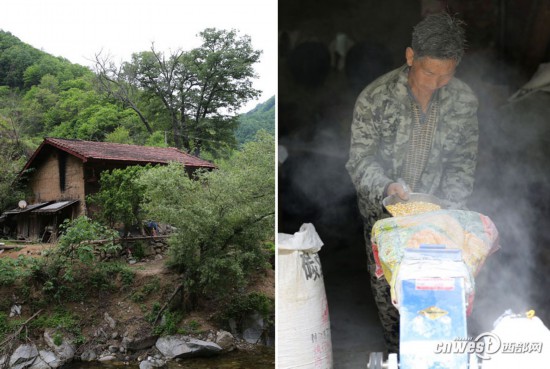 5月9日,汉中佛坪岳坝镇狮子坝村,60岁的方如生在老房子里磨玉米粉,细细的玉米粉尘飘着,染白了他的脸和头发。