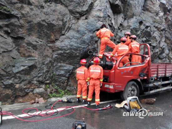 310国道落石砸中过往车辆一人被困,消防紧急救援。