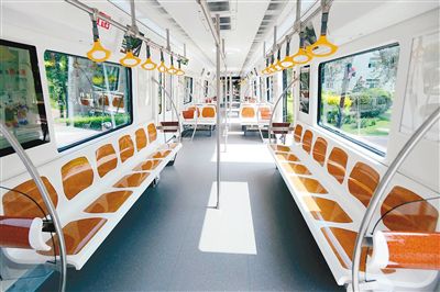 机场线车辆美观大方,饱满圆润的大流线型车体给人以速度感和冲击力,简单的“松石蓝”腰线贯穿整个纯白车身,内部车辆座椅暖色的蜂窝状花纹使车辆更具层次感。