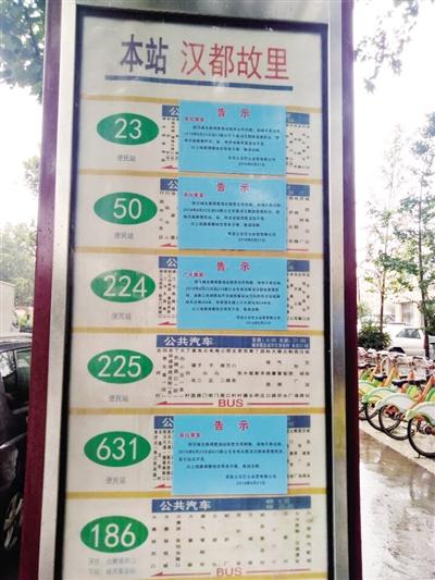 王女士说,她家住在汉城北路汉都故里小区,门前有6条公交线,她在土门上班,每天乘坐23路和631路就可直达单位附近,十分方便。可是,8月20日下班回到小区门口的公交车站时,发现有224路、50路、23路、631路公交站牌上贴着一张告示称: 8月23日起,这4条公交线路取消汉都故里便民站。“汉城北路沿线除了汉都故里小区外,还有雅卓花园、简约花园和风尚馨筑等多个居民小区,涉及的居民比较多,一下子取消了4条公交线,将会给多少人的出行带来不便?”王女士说,8月23日早上,她在小区门口公交车站准备乘坐公交车去上班时,发现只剩下225路和186路,另外4趟公交车均不见踪影。她朝南步行了10分钟左右来到城西客运站时,发现这4条线路的起点站原来被挪移到了此处。