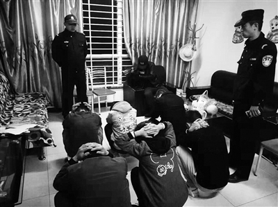 早上6时许,经开分局全部参战警力集结完毕,按照行动方案部署,奔赴各目标小区开展工作。在一小区,民警趁一窝点涉传人员打开房门,准备外出早课之机冲入房内,控制住涉传人员6名。