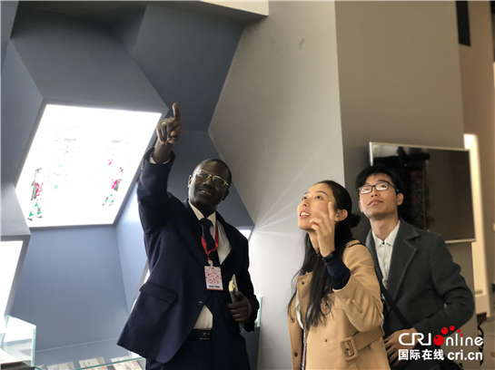 塞内加尔驻华大使馆一等秘书夏赫·恩迪亚耶(左)了解渭南皮影戏(摄影 张琳瑞)