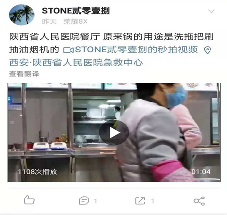 11月6日14:50,“西安直播”等微博号转发网友爆料:“11月5号,在西安市某医院食堂内,清洁人员站在灶台上在打扫油烟机上的污渍时,竟直接把清洁油烟机的拖把放到灶台上的锅里清洗,丝毫不避讳外面的食客。目前,餐厅方面对此还未作出回应。”此视频同时被“新浪财经”、“深圳商报”等多个媒体官微点名转发。