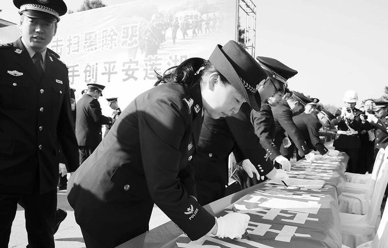 活动现场,公安莲湖分局副局长张根勤致辞,分局各部门设立宣传台,结合自身工作了开展有声有色的宣传活动。分局政工科、巡特警大队、刑侦大队、扫黑办、治安大队、及分局13个派出所民警代表在“扫黑除恶”“平安创建”宣传点上展示风采,通过介绍宣传展板、发放宣传彩页、解答业务问题的方式向现场市民宣讲“扫黑除恶”和“平安创建”知识。分局副局长杜保华带领民警进行集体宣誓,并和民警及志愿者在寓意着全民同心、共同除恶的“有黑扫黑、有恶除恶、无恶治乱”宣传横幅上签名。