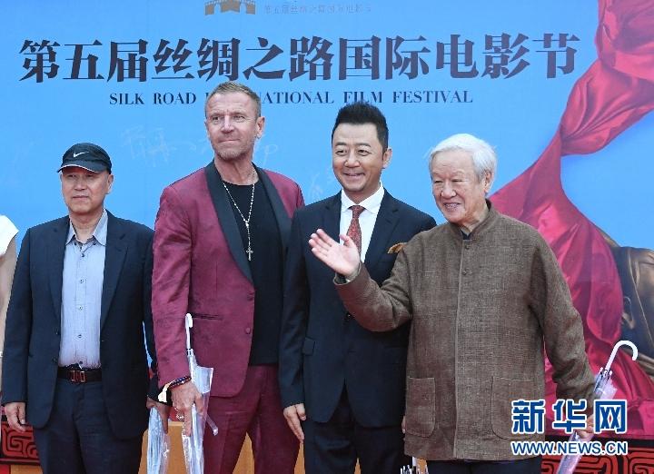 10月13日,第五届丝绸之路国际电影节评委会成员谢飞、郭涛、雷尼·哈林、霍廷霄(从右至左)亮相红毯。新华社记者 张博文 摄