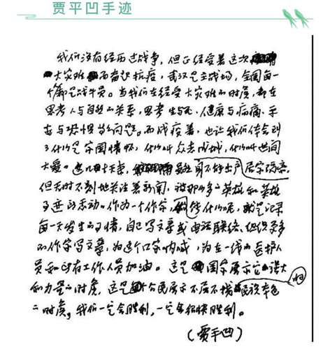 3月5日,著名作家贾平凹接受新华每日电讯草地副刊专访时表示,此次邀请全国知名作家撰稿参与《共同战“疫”》,就是要用作家的视角,以记录的形式“抒写抗击疫情中平凡人的不平凡,以及引发的深刻思考”。