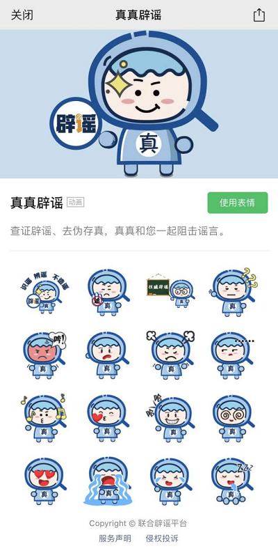 微信表情商店搜索“真真辟谣”,进入表情专辑,点击“使用表情”,即可使用。