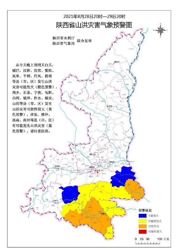陕西省水利厅与陕西省气象局联合发布山洪灾害气象预警:预计2021年8月28日20时至2021年8月29日20时,镇巴、汉阴、汉滨、紫阳、岚皋、平利、丹凤、商南等县(市、区)发生山洪灾害可能性大(橙色预警),西乡、石泉、宁陕、旬阳、白河、镇坪、柞水、镇安、山阳等县(市、区)发生山洪灾害可能性大(黄色预警),洋县、佛坪、洛南、商州等县(市、区)有可能发生山洪灾害(蓝色预警)。请注意防范。