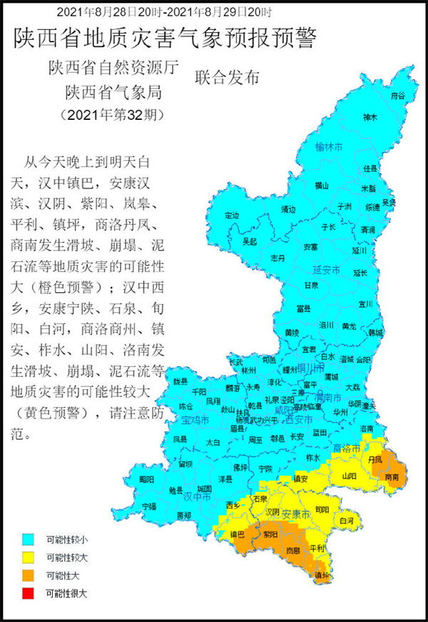 陕西省自然资源厅与陕西省气象局联合发布地质灾害气象预报预警:预计2021年8月28日20时至2021年8月29日20时,汉中镇巴,安康汉滨、汉阴、紫阳、岚皋、平利、镇坪,商洛丹凤、商南发生滑坡、崩塌、泥石流等地质灾害的可能性较大(橙色预警);汉中西乡,安康宁陕、石泉、旬阳、白河,商洛商州、镇安、柞水、山阳、洛南发生滑坡、崩塌、泥石流等地质灾害的可能性较大(黄色预警),请注意防范。