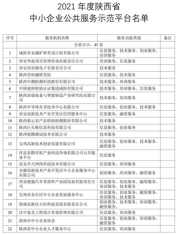 一、授予咸阳非金属矿研究设计院有限公司等45家平台“陕西省中小企业公共服务示范平台”称号。省级示范平台认定有效期三年。