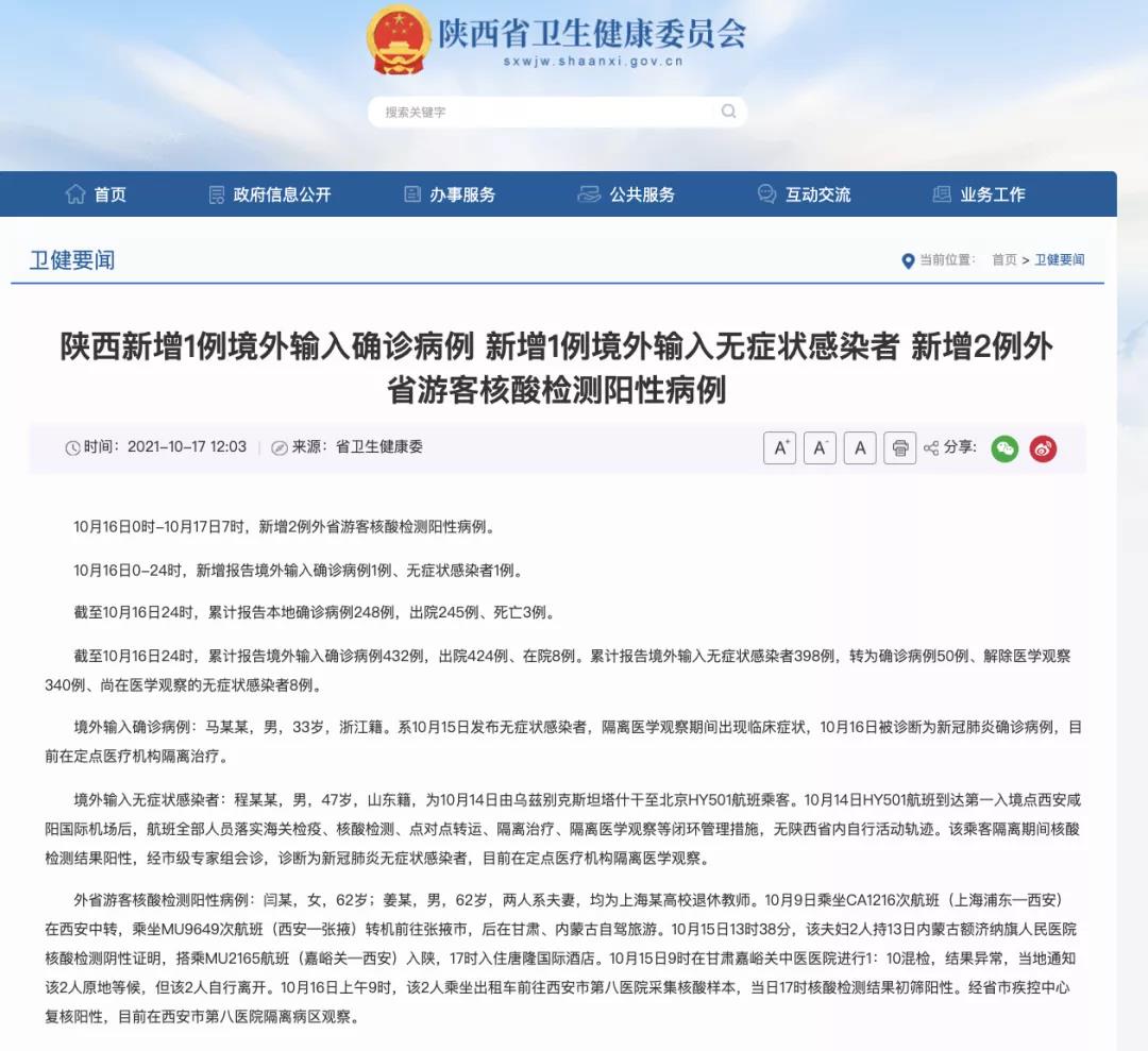 陕西卫健委刚刚通报:10月16日0时-10月17日7时,新增2例外省游客核酸检测阳性病例。