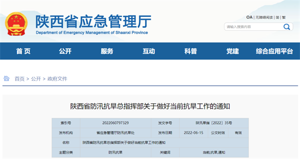 近期我省降水偏少,气温持续偏高,导致陕北北部、陕南东部、渭北出现轻到中度干旱,其中榆林、商洛、渭北局地出现严重干旱。后期降水仍将分布不均,旱情发展演变升级快,影响到工农业生产安全。为做好当前抗旱工作,现就有关要求通知如下: