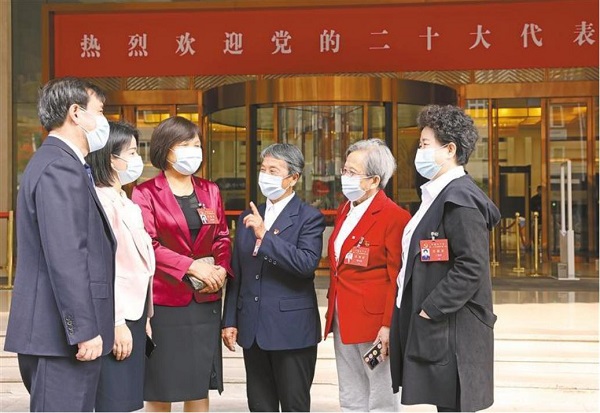十月十四日,出席党的二十大的陕西代表王友民、何菲、常亚琼、张莲莲、路生梅、王照辉(左起)在住地交流履职感想。代表们一致表示,将坚决扛起政治责任,以饱满的热情认真履行好神圣职责。