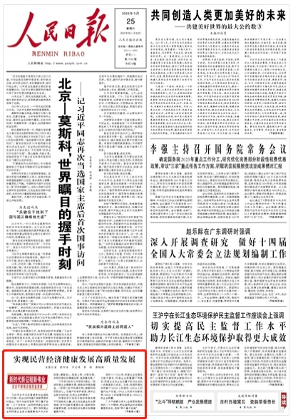 3月25日,《人民日报》头版刊发文章《实现民营经济健康发展高质量发展(新时代新征程新伟业·坚定不移推动高质量发展)》,其中聚焦陕西民营经济发展。