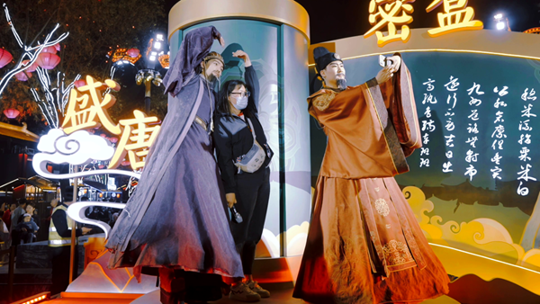 “《西游记》中九九八十一难,第一难是什么?”“不知道,不要紧,来,拍个照。”夜色渐浓,西安市大雁塔下的大唐不夜城华灯熠熠,流光溢彩。两位身着古装的演员,分别扮演唐代名人房玄龄和杜如晦,出题与游客进行互动,幽默风趣的提问和回答引得台下观众不时发出阵阵欢笑。