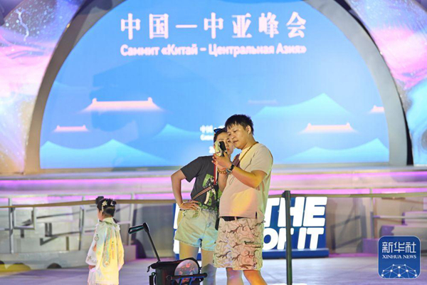 ↑5月15日,在西安大唐不夜城一处中国-中亚峰会活动展演舞台前,来自山西的游客回看拍摄的视频。新华社记者 宋为伟 摄