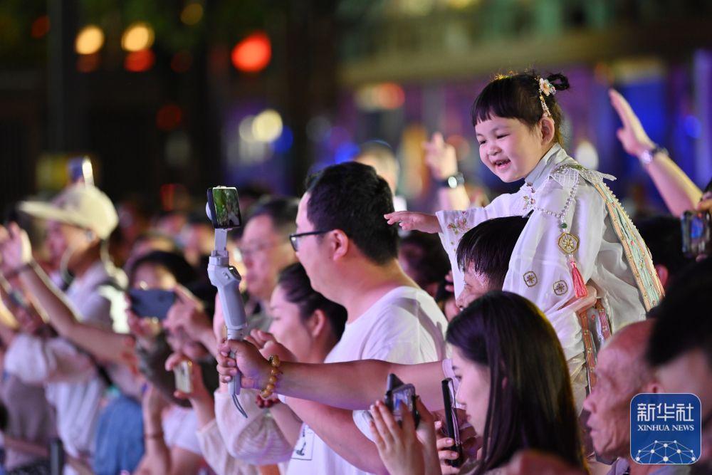 ↑5月15日,在西安大唐不夜城,身着古装的小朋友骑在父亲的肩上参与互动演出。新华社记者 宋为伟 摄