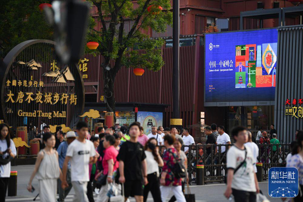 ↑这是5月15日拍摄的西安市雁塔区一处商场外的中国-中亚峰会宣传海报。新华社记者 张博文 摄