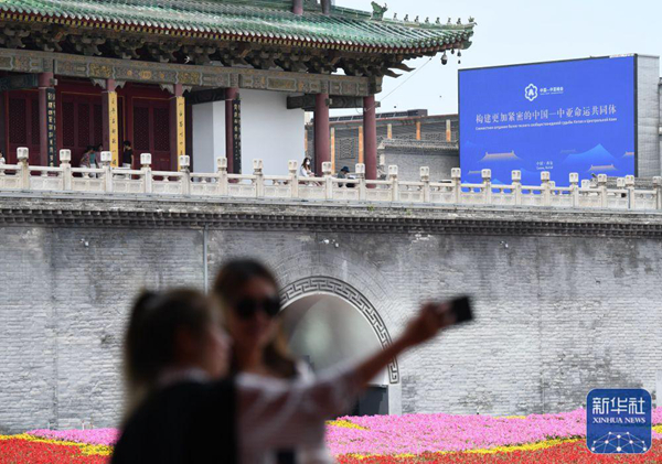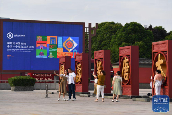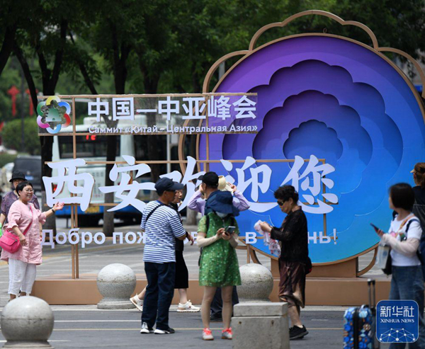 ↑5月16日,游客在西安市北大街上与中国-中亚峰会主题装置合影。新华社记者 李一博 摄
