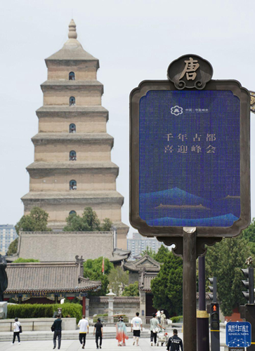 ↑西安大雁塔周边展示的电子广告牌(5月16日摄)。新华社记者 邵瑞 摄